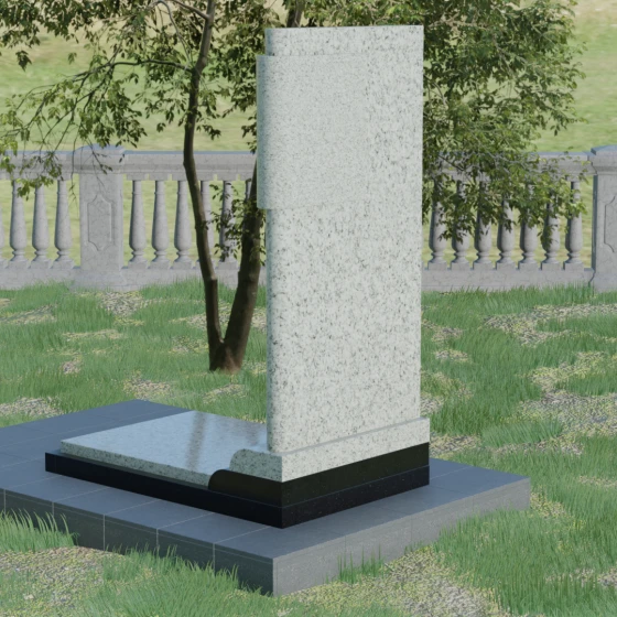 Геометрия модели продумана до мелочей: левая сторона стелы дополнена асимметричным вертикальным элементом с многоступенчатым завершением. Эта "ступенчатость" придает конструкции динамику и современный вид, выделяя её среди традиционных прямоугольных форм. Особое значение имеет сочетание фактур: идеально гладкая, зеркальная полировка основной части стелы эффектно контрастирует с шероховатой, тактильно приятной поверхностью боковых элементов. Зеркальный блеск гранита не только подчеркивает глубину цвета, но и защищает камень от внешних воздействий, позволяя мемориалу сохранять первозданный вид на протяжении столетий.