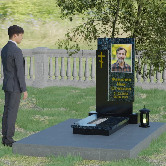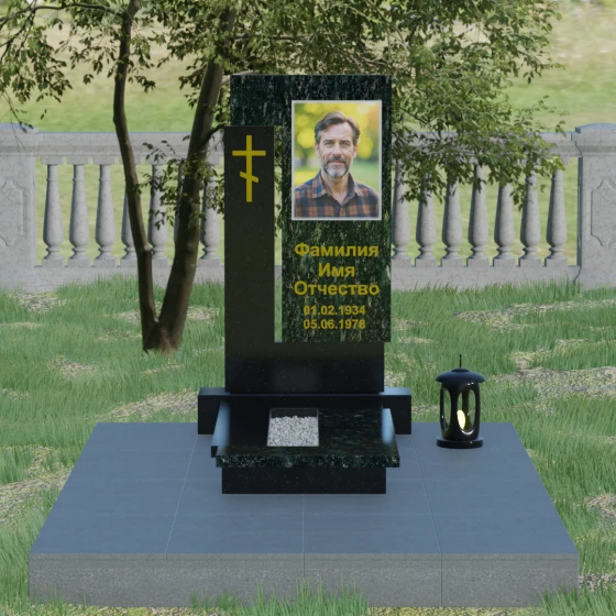 На боковом пилоне расположен каноничный православный крест. Его исполнение отличается благородной простотой — это лаконичный трехсоставный символ веры, который не перегружает композицию, но расставляет необходимые духовные акценты. Благоустройство участка продумано до мелочей: стела установлена на широкий полированный цоколь, а место захоронения полностью закрыто сплошной надгробной плитой. Такое решение не только придает ансамблю вид законченного монолита, но и обеспечивает практичность, избавляя от необходимости сложного ухода за почвой.
