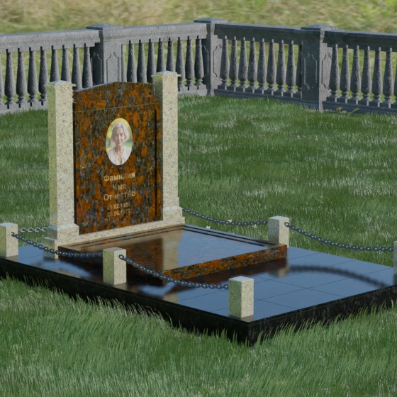 Особого внимания заслуживает полное благоустройство участка, входящее в концепцию модели 011. Памятник устанавливается на массивный гранитный цоколь, который придает всей конструкции устойчивость и защищает её от сезонных подвижек грунта. Вместо открытого цветника здесь используется сплошная надгробная плита, закрывающая всю площадь захоронения. Это создает эстетически законченный, строгий вид и значительно упрощает уход за могилой — вам не придется бороться с сорняками или обновлять засыпку. Завершают композицию аккуратные каменные столбики с декоративными цепями, которые обозначают границы частного пространства, создавая атмосферу уединения и покоя.