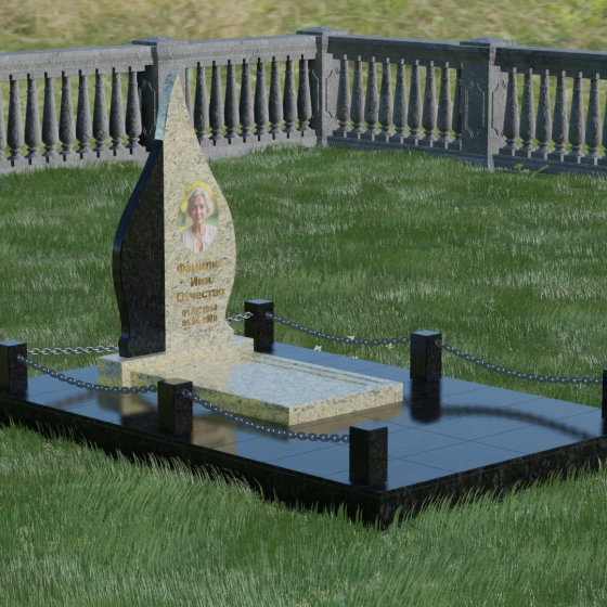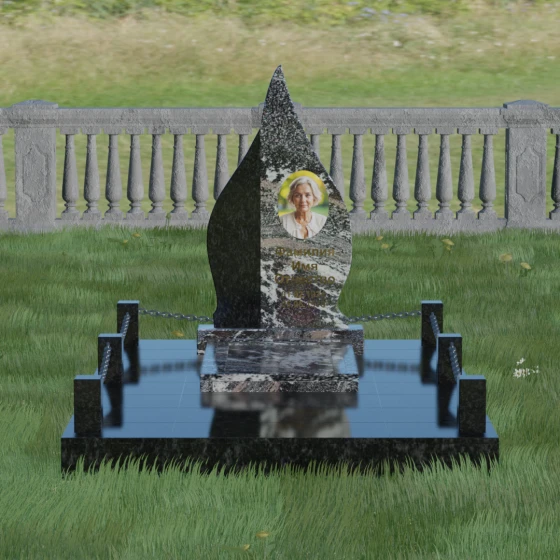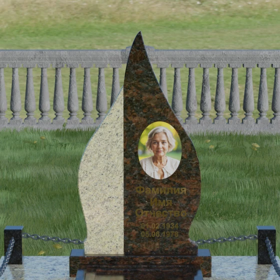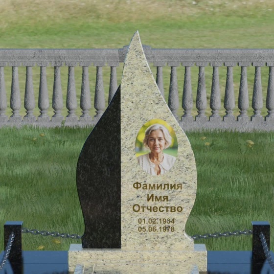 Выбор мемориального изделия — это всегда глубоко личный процесс, стремление выразить в камне ту нежность и уважение, которые мы храним в сердце. Модель 018 воплощает в себе гармонию и завершенность. Величественная стела выполнена в форме изящного, стремящегося ввысь пламени или капли, что символизирует вечный свет души и неугасаемую память. Асимметричная геометрия с мягкими, плавными изгибами лишена острых углов, что подчеркивает идею спокойствия и вечного упокоения. Особое внимание привлекает сочетание двух контрастных видов камня: светлая левая часть стелы с её благородной зернистой фактурой мягко огибает темную зеркальную сердцевину. Этот контраст создает визуальный объем и глубину, подчеркивая уникальность композиции и делая её заметной на фоне традиционных строгих форм.