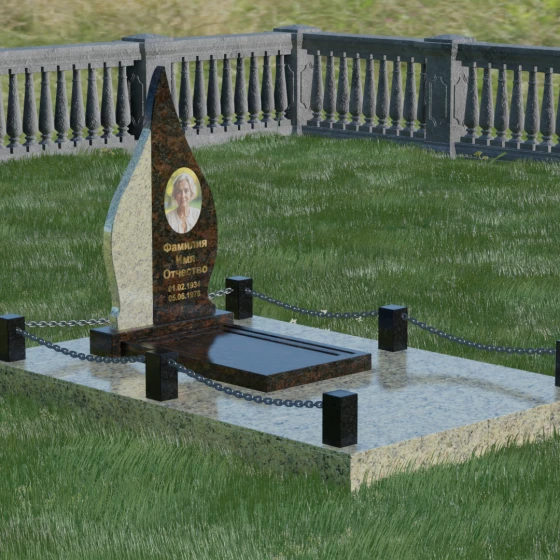 Конструкция модели 018 продумана до мелочей, включая полное благоустройство места захоронения. Монумент устанавливается на массивный двухцветный постамент, который обеспечивает устойчивость всей вертикальной конструкции. Особое внимание уделено обустройству прилегающей территории: вместо открытого грунта используется сплошное мощение плитами из натурального гранита. Это не только придает мемориальному комплексу законченный и достойный вид, но и значительно упрощает уход за ним, исключая появление сорняков и скопление грязи. Периметр участка обозначен строгим и лаконичным ограждением в виде невысоких каменных столбиков-боллардов, соединенных декоративными металлическими цепями. Такая ограда создает приватную зону, не загромождая пространство, и подчеркивает элитарность комплекса.