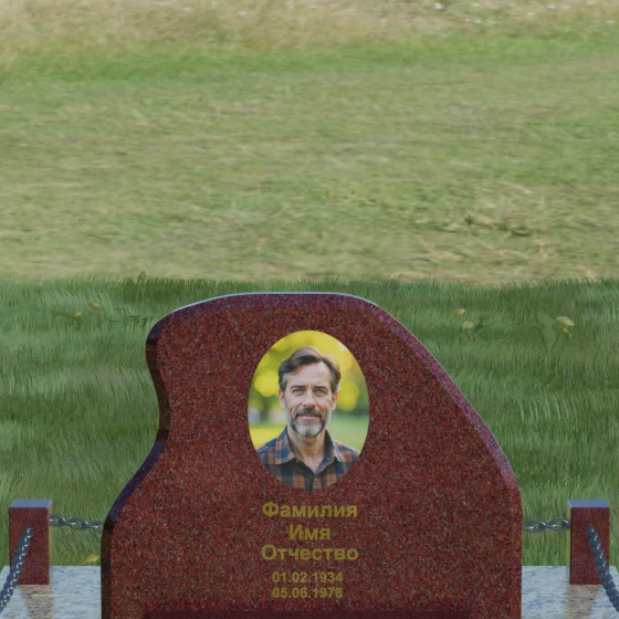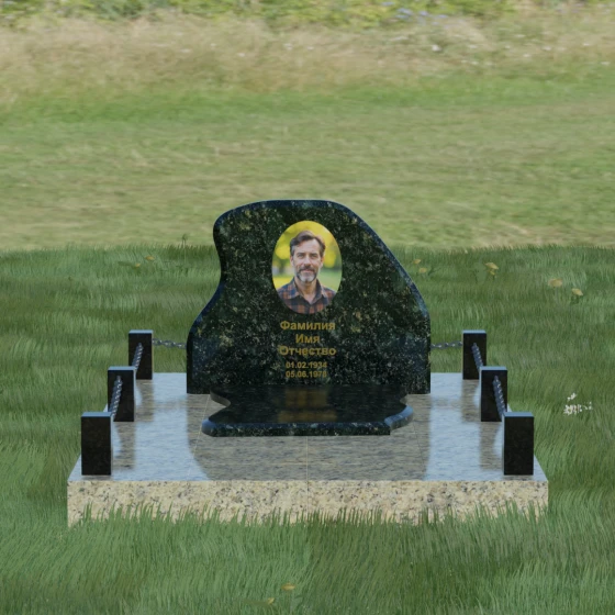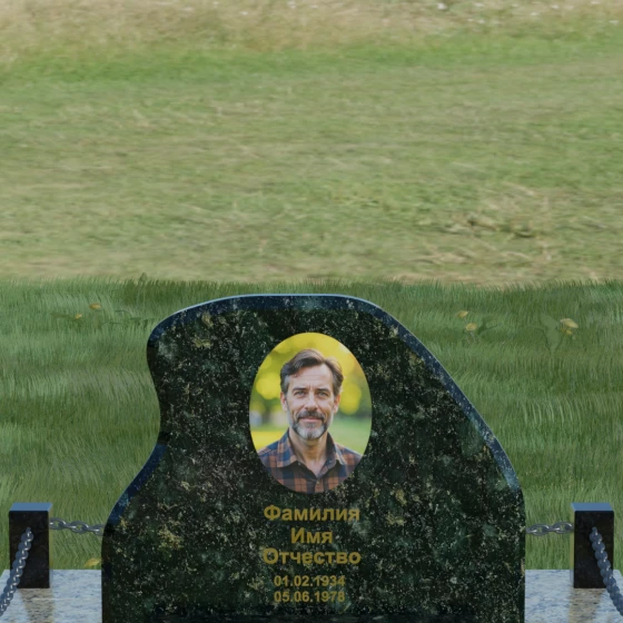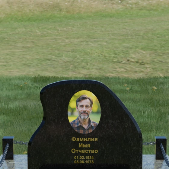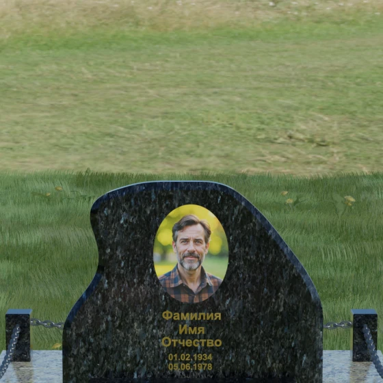 На фронтальной плоскости предусмотрено место для портрета в овальном обрамлении, который располагается в верхней трети композиции, притягивая взгляд. Текстовая информация — фамилия, имя и даты — наносится методом глубокой гравировки с последующим покрытием контрастным составом «под золото», что идеально сочетается с темными породами камня и обеспечивает читаемость надписей на многие годы. Каждая фаска, каждый срез камня обработаны с филигранной точностью, что подчеркивает высокий статус изделия.