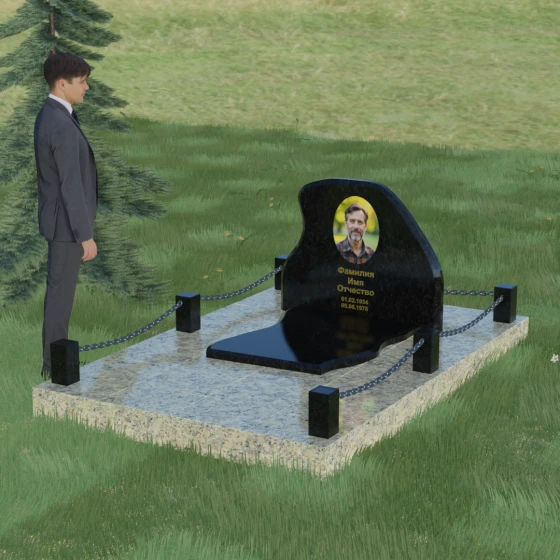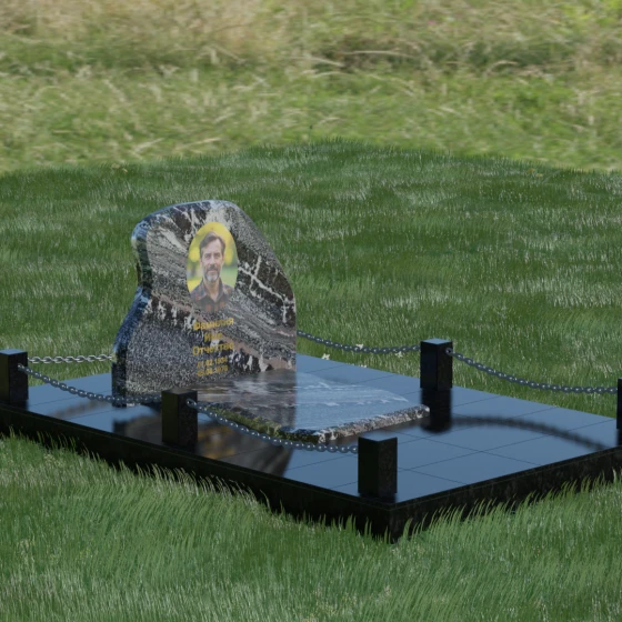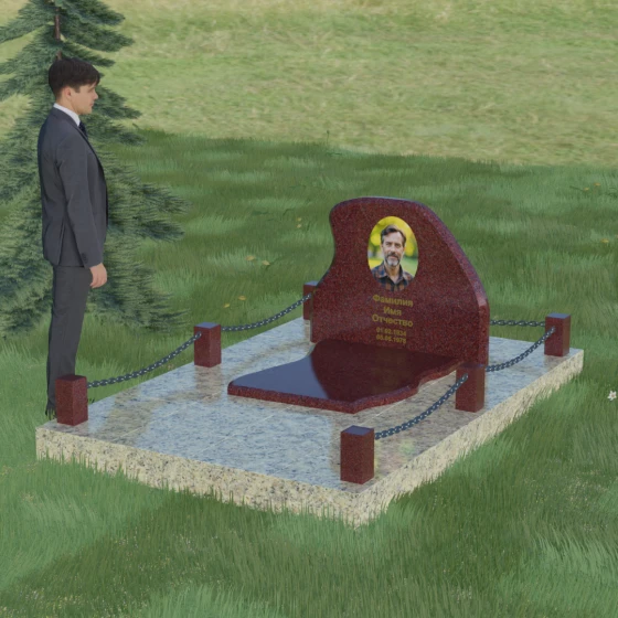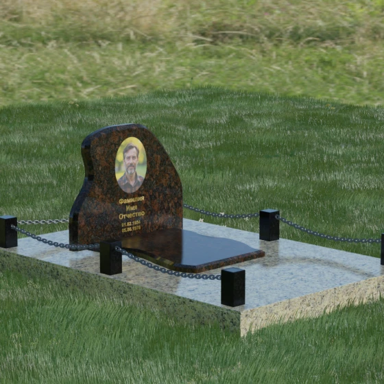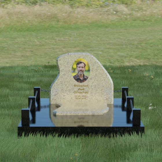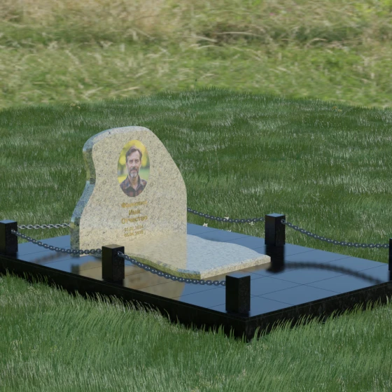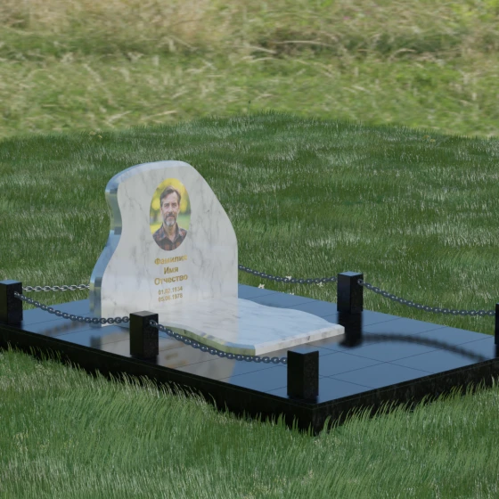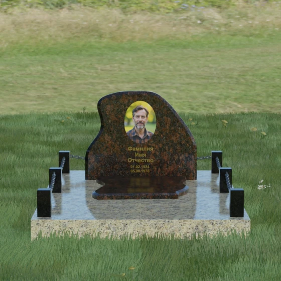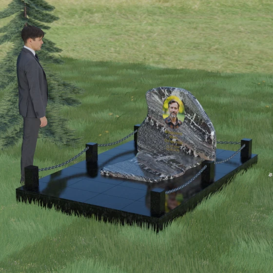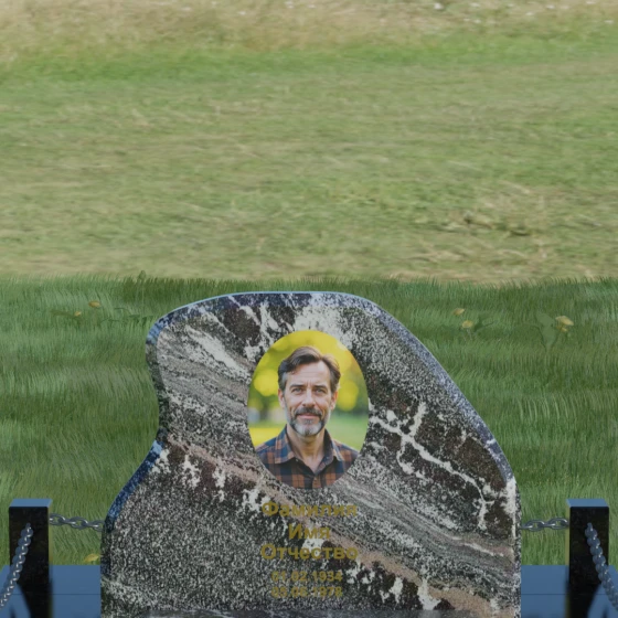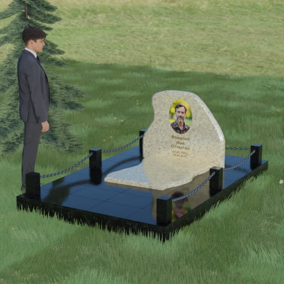 Плавная волна на камне — это символ вечного движения души, ее перехода в иное состояние, а строгий цоколь и цепи олицетворяют защиту и нерушимость семейных уз.