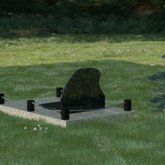 Периметр участка обозначен декоративным ограждением, состоящим из четырех строгих гранитных столбиков с пирамидальными навершиями. Между столбиками натянуты массивные металлические цепи темного оттенка, которые создают визуальную границу священного пространства, не перегружая ландшафт лишними деталями. Этот элемент подчеркивает европейский стиль оформления, где акцент делается на качестве материалов и чистоте линий.