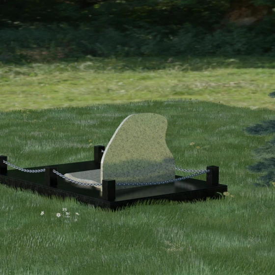 Стела мемориала обладает уникальной асимметричной геометрией, в которой строгость прямых линий встречается с текучестью природных форм. Левая грань памятника оформлена в виде глубокой, идеально выверенной волны. Этот плавный изгиб придает массивному камню визуальную легкость и динамику, напоминая о движении жизни. Верхушка стелы имеет мягкое округлое завершение, которое плавно переходит в вертикальный правый край, создавая силуэт, схожий с парусом или небесным сводом. Все видимые поверхности проходят многоэтапную зеркальную полировку, благодаря чему на гранях возникает завораживающая игра света и тени: малейший луч солнца подчеркивает глубину фактуры камня, создавая эффект внутреннего свечения.