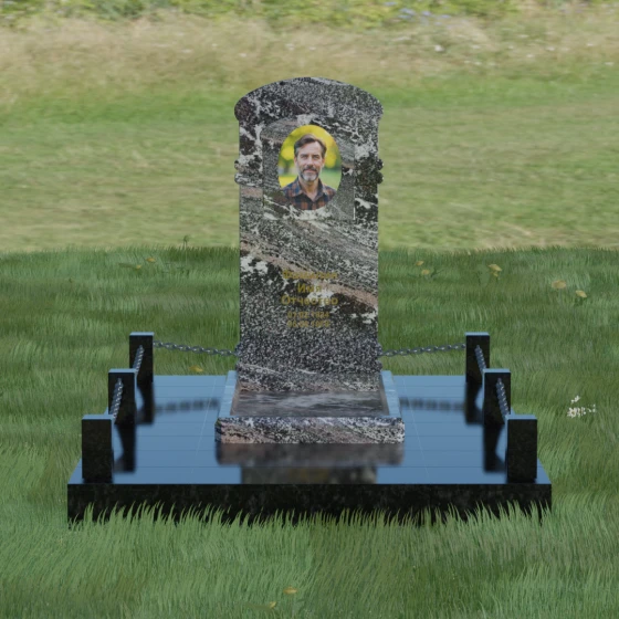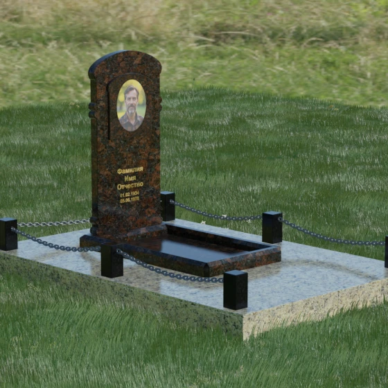 Представленная мемориальная композиция — это воплощение архитектурного баланса, где строгость классических форм встречается с мягкостью художественных линий. В центре ансамбля находится вертикальная стела с уникальной геометрией: её верхняя грань образует пологую, торжественную арку, которая плавно переходит в декоративные выступы на боковых гранях. Особенностью модели является глубокая резная ниша в форме идеального овала, создающая естественное обрамление для портрета. Внутренняя дуга, вырезанная в теле камня над портретной зоной, имитирует свод священной арки, придавая изделию объем и глубину. Зеркальная полировка основной плоскости создает глубокий, почти мистический блеск, в котором отражается небо, подчеркивая монументальность и чистоту исполнения каждой детали.