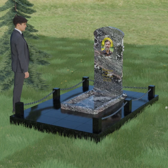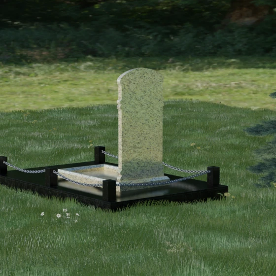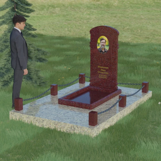 Благоустройство участка продумано до мелочей и формирует законченное сакральное пространство. Основание мемориала установлено на массивный гранитный цоколь, который служит надежным фундаментом и защищает конструкцию от сезонных изменений почвы. Территория полностью облицована широкоформатными полированными плитами — такое решение не только придает эстетическую завершенность, но и гарантирует безупречный вид участка на десятилетия, сводя уход за ним к минимуму. По периметру установлены строгие квадратные столбики из камня, соединенные декоративными цепями. Эта деталь визуально очерчивает границы личного пространства, создавая атмосферу уединения и покоя, отделяя место памяти от остального мира.