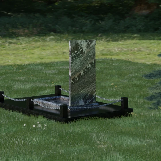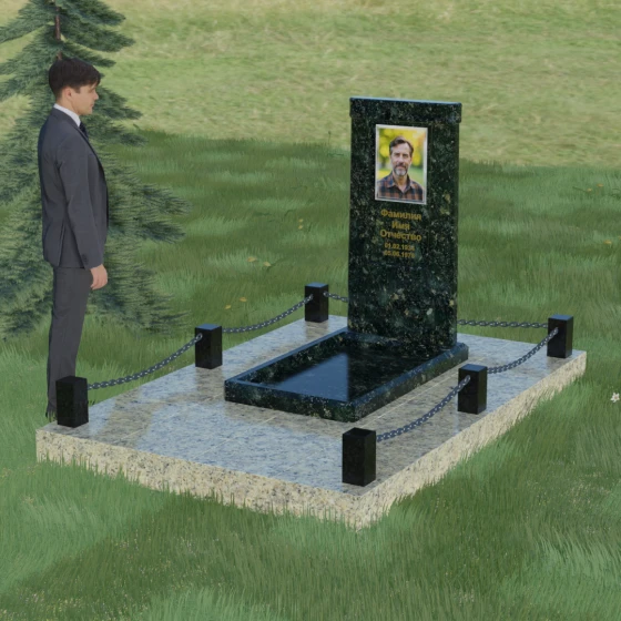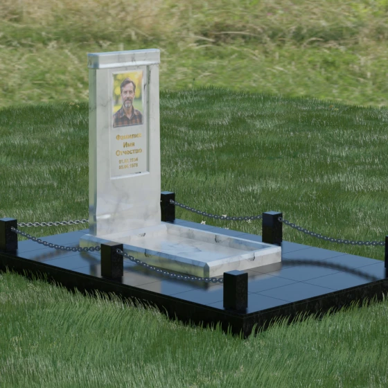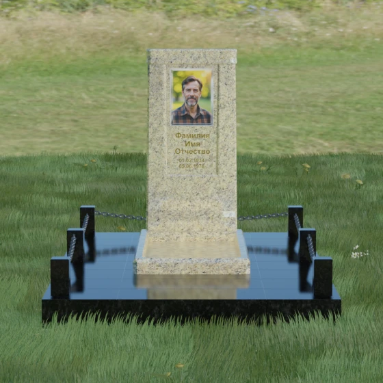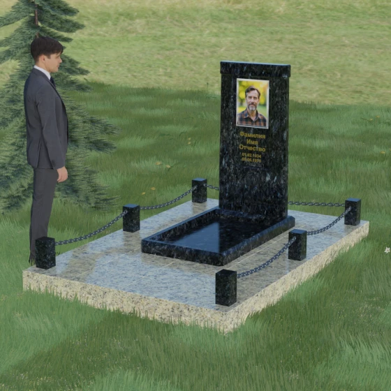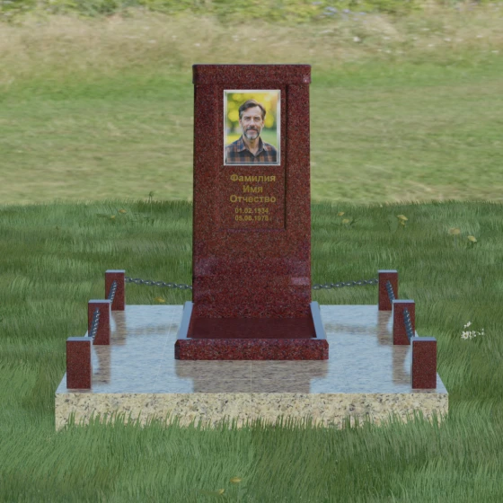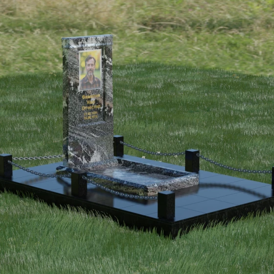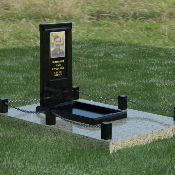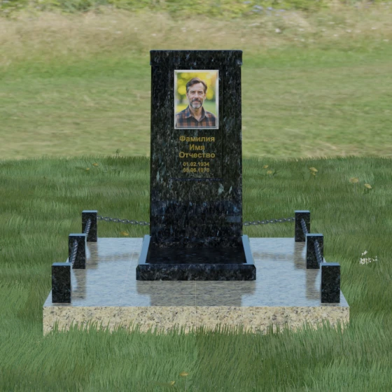 Особое внимание уделено благоустройству прилегающей территории. Монумент устанавливается на прочный гранитный цоколь, который служит надежным фундаментом и предотвращает перекос конструкции со временем. Участок полностью облицован массивными плитами из натурального камня в едином стиле с основным изделием. Такое решение не только придает захоронению законченный и опрятный вид, но и значительно упрощает уход за ним, исключая прорастание сорной травы. Периметр композиции обозначен строгими гранитными столбиками, соединенными декоративными цепями. Эти элементы создают визуальную границу уединения и покоя, превращая место памяти в достойный архитектурный ансамбль. Внутренняя ниша стелы идеально подходит для размещения широкоформатной фотокерамики или гравировки, дополненной покрытием сусальным золотом, что особенно эффектно смотрится на темных сортах камня.