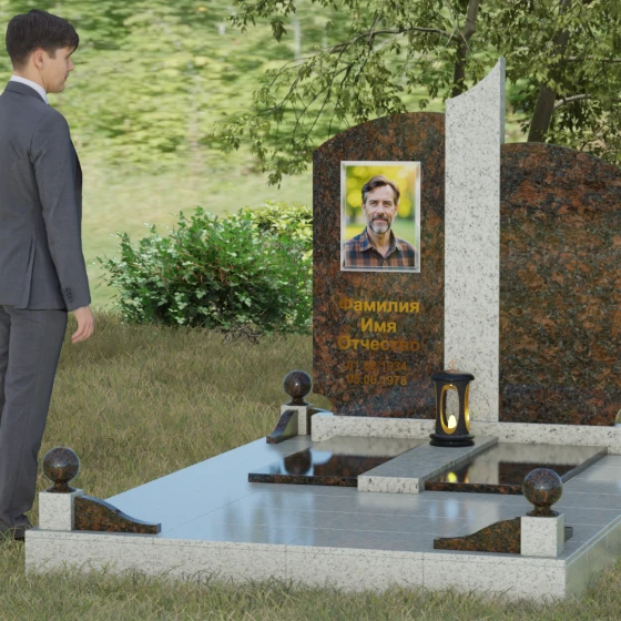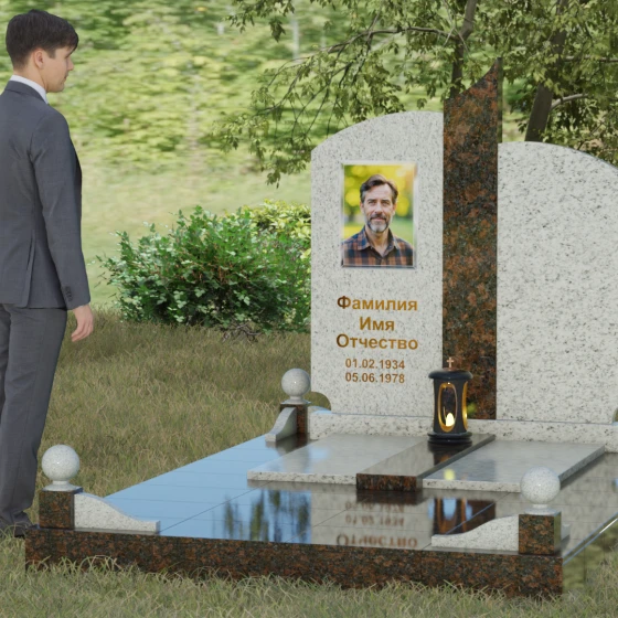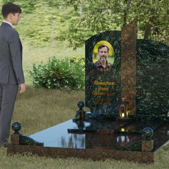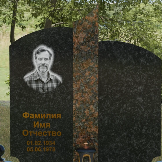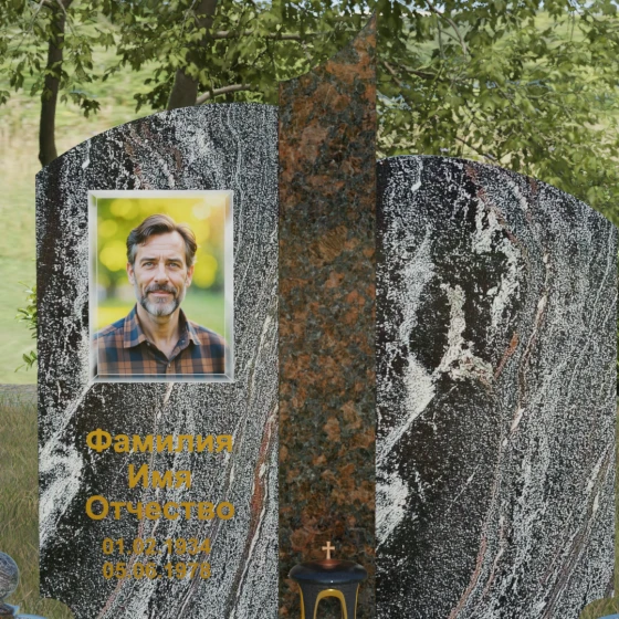 На широкой левой части композиции идеально располагается гравированный портрет или фотокерамическое панно. Темный фон основного камня обеспечивает максимальную контрастность для золоченой надписи, делая каждое слово четким и легко читаемым. Мы понимаем, как важно передать теплоту ваших чувств, поэтому наши мастера помогут подобрать шрифт и размер элементов оформления так, чтобы они гармонировали с величественной геометрией камня. Пусть этот мемориал станет достойным символом вашей любви и преданности, сохраняя историю жизни для будущих поколений.