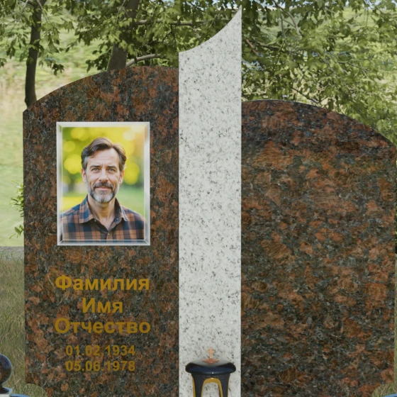 Гранитный монумент артикула 068 представляет собой гармоничную архитектурную композицию, которая выделяется на фоне традиционных решений своей благородной асимметрией и сложной игрой фактур. В основе дизайна лежит сочетание двух контрастных видов камня, разделенных изящной вертикальной вставкой. Основные элементы мемориала имеют мягкие, дугообразные завершения, напоминающие своды храма или спокойные изгибы горизонта. Такое решение лишает памятник излишней суровости, привнося в облик места захоронения чувство умиротворения и светлой печали. Особое внимание привлекает центральный декоративный элемент: узкая колонна из текстурного гранита с рваной или полированной поверхностью служит смысловым акцентом, соединяющим две части надгробия в единый ансамбль.