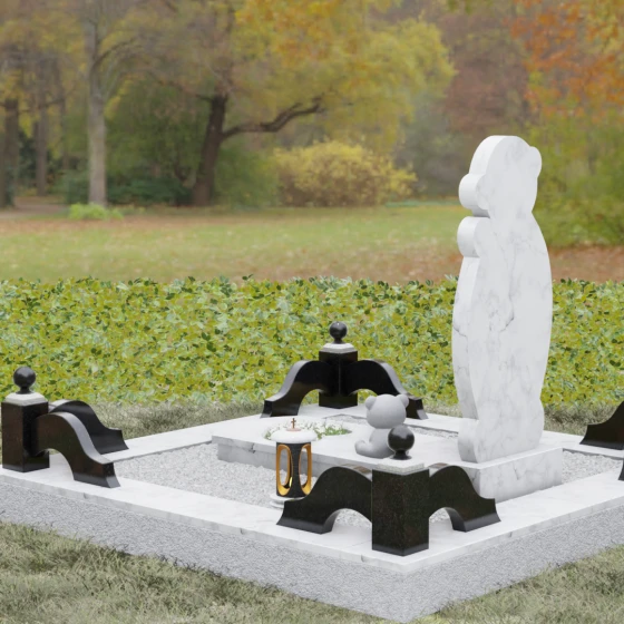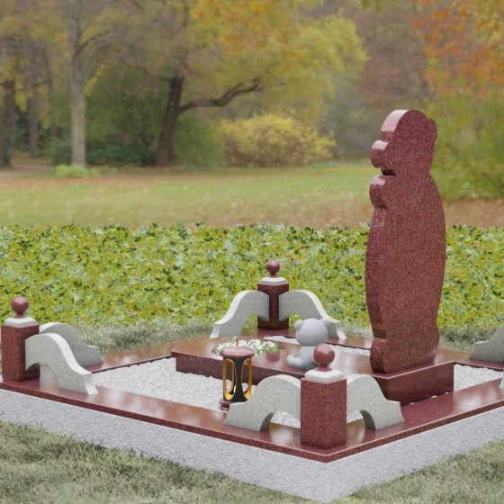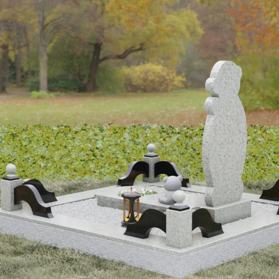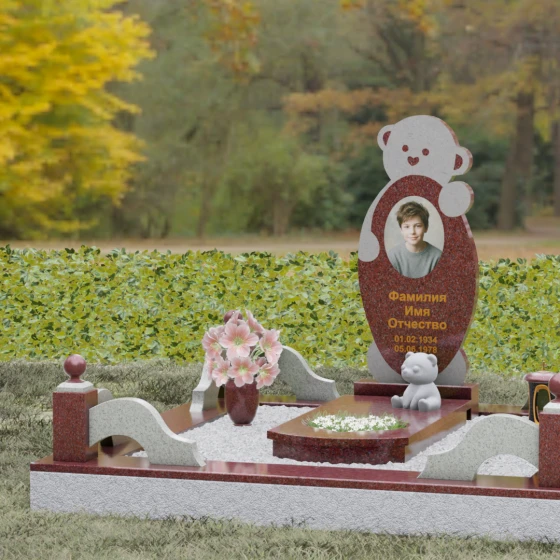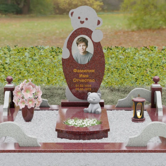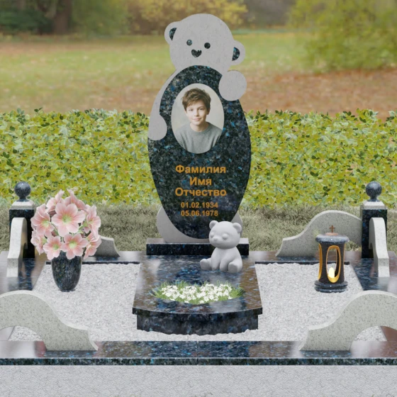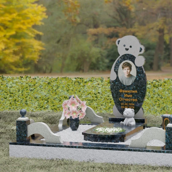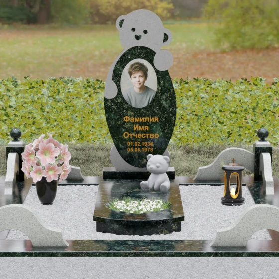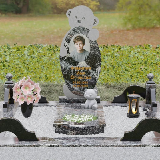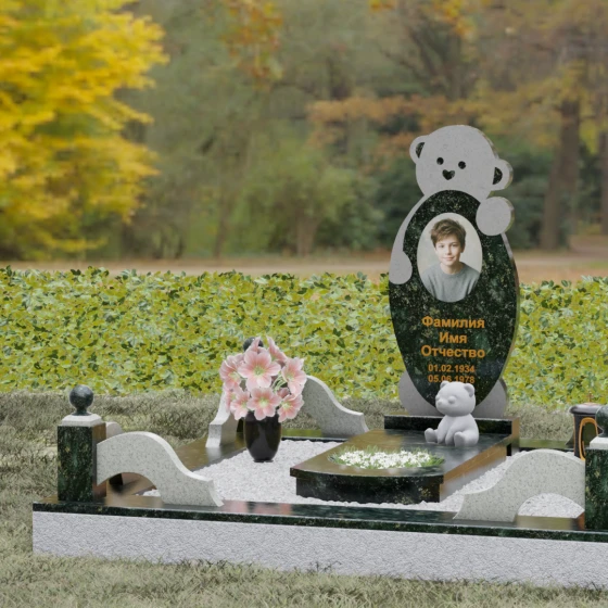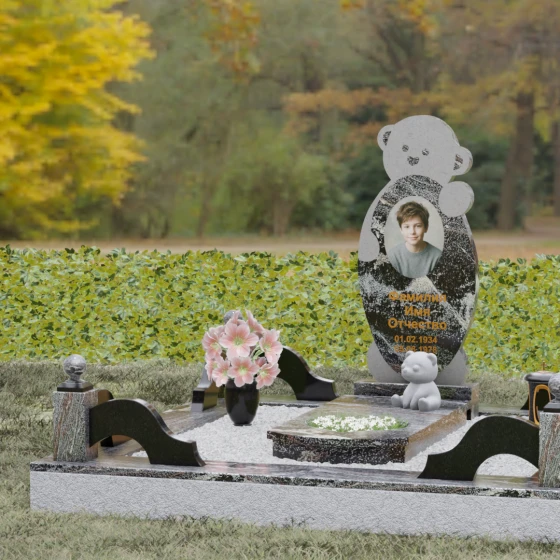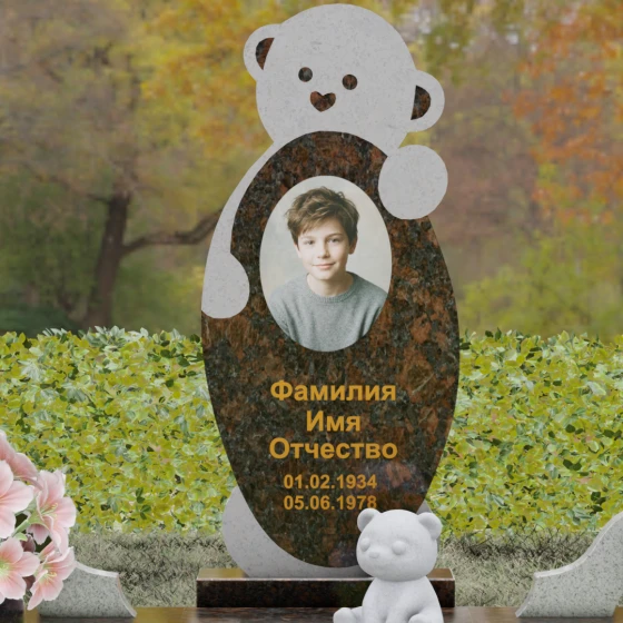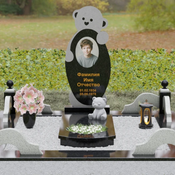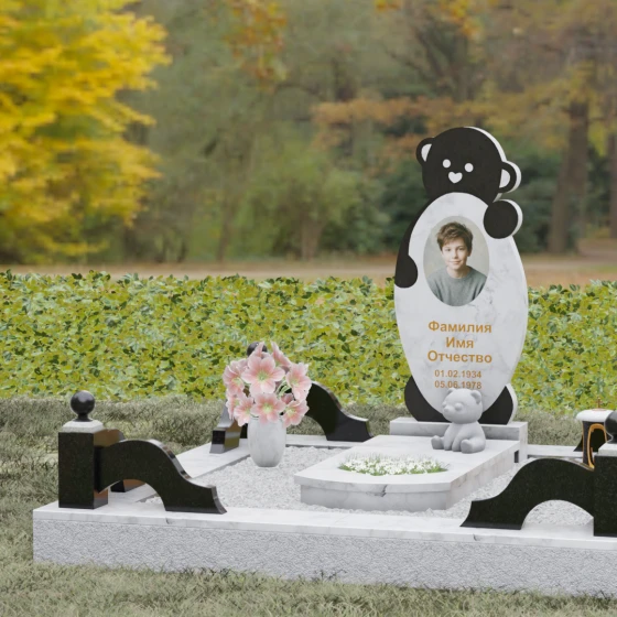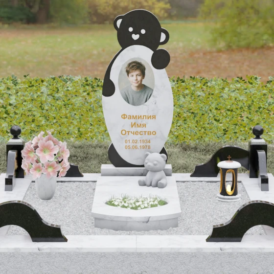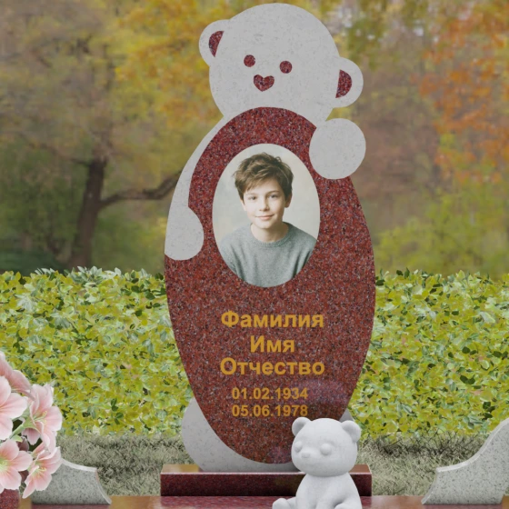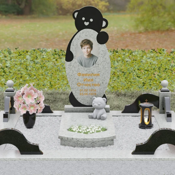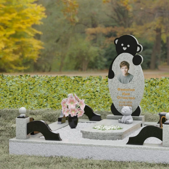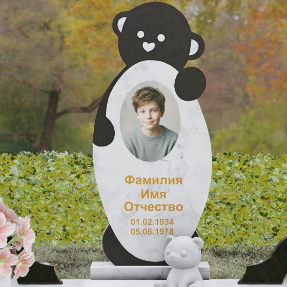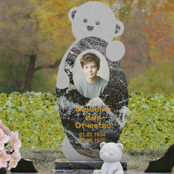 Особое внимание уделено деталям резьбы: носик медвежонка выполнен в форме небольшого сердца, что придает всей конструкции особую эмоциональную глубину. Центральная часть стелы предназначена для размещения классического овального портрета, который гармонично вписывается в общую геометрию. Грани камня обработаны с ювелирной точностью — фаски мягко преломляют свет, подчеркивая безупречную чистоту природного материала и высокое мастерство камнерезов.