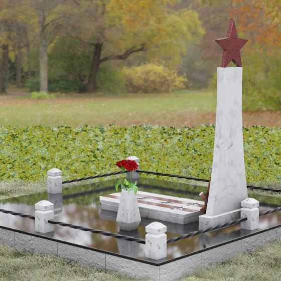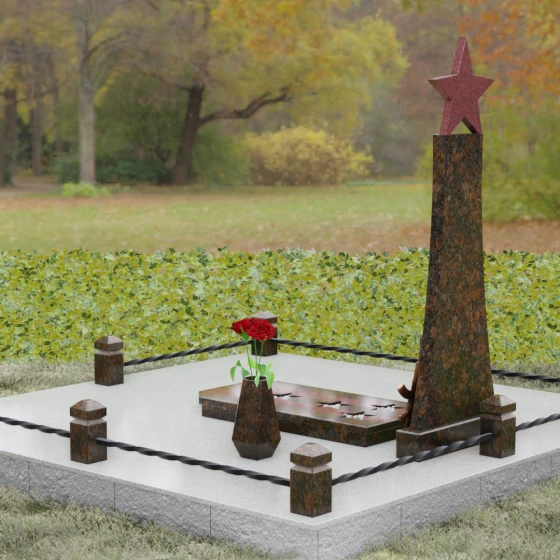 Мемориальный комплекс под артикулом 190 — это воплощение мужества, дисциплины и вечной памяти о человеке, чья жизнь была неразрывно связана с воинским долгом. Центральное место в композиции занимает высокая вертикальная стела, имеющая строгую, сужающуюся кверху геометрию. Такая форма выбрана неслучайно: она создает мощную визуальную вертикаль, направляющую взгляд зрителя ввысь, символизируя духовное восхождение и бессмертие подвига. Венчает монумент объемная пятиконечная звезда насыщенного красного цвета — символ чести и принадлежности к офицерскому корпусу. Одной из самых значимых и уникальных деталей данной модели является реалистично выполненная объемная фигура автомата Калашникова, прислоненного к боковой грани стелы. Этот элемент резьбы выполнен с безупречной точностью, подчеркивая профессиональный путь усопшего. Надгробие из натурального камня в таком исполнении выглядит величественно и бескомпромиссно, заявляя о силе характера того, кому оно посвящено.