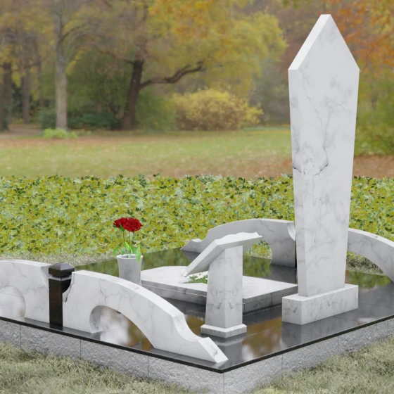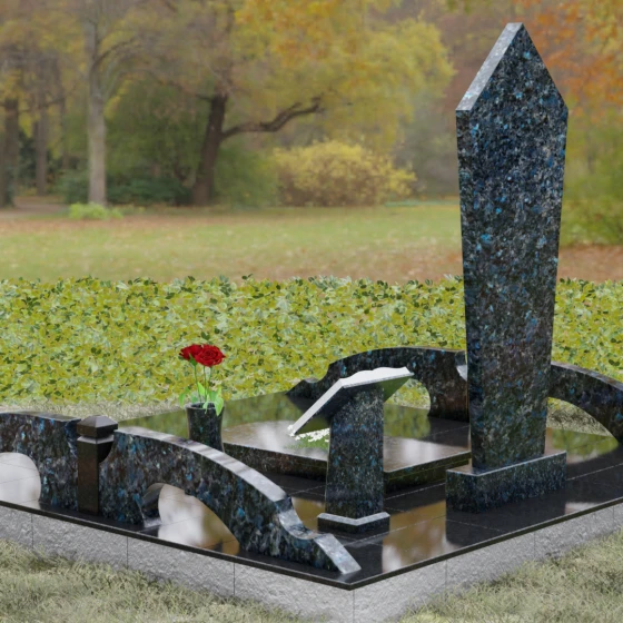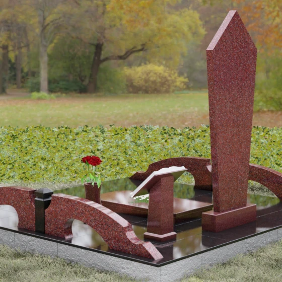 Данная модель предполагает комплексное решение по благоустройству участка. Памятник устанавливается на массивный двухступенчатый постамент, обеспечивающий надежную устойчивость конструкции. По периметру захоронения предусмотрен гранитный цоколь — строгий каменный бордюр, который визуально очерчивает границы мемориала и придает ему завершенный вид. Рядом с основной стелой располагается дополнительный элемент в форме раскрытой книги на наклонном гранитном основании. Это изящное дополнение служит идеальным местом для размещения эпитафии или памятных слов. В состав комплекса также входит лаконичная гранитная ваза, позволяющая поддерживать порядок и эстетику в оформлении цветами.