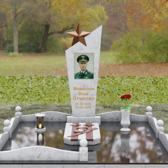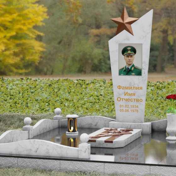Основу композиции составляет массивное каменное полотно с уникальной асимметричной геометрией. Верхний край обелиска уходит в резкий диагональный подъем, создавая динамичный силуэт, устремленный к небесам. Венчает эту вершину объемная пятиконечная звезда — символ, выполненный в теплом бронзовом оттенке, который эффектно контрастирует с основным цветом камня. Зеркальная полировка лицевой грани доведена до эталонного блеска: поверхность буквально оживает, отражая окружающий мир и создавая глубину, в которой запечатлен портрет. Прямые, строгие линии боковых граней подчеркнуты аккуратными фасками, что придает всей конструкции архитектурную завершенность и визуальную легкость при сохранении колоссальной физической прочности.