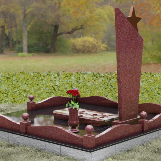 Мемориальный ансамбль представляет собой законченное архитектурное решение. Основание покоится на массивном цоколе, который не только обеспечивает устойчивость всей конструкции, но и служит визуальным фундаментом памяти. Ограждение участка выполнено в едином стиле с основным памятником: низкие гранитные бордюры имеют плавный, волнообразный верхний срез, смягчающий строгость мужского монумента. Углы ограды оформлены декоративными столбиками, каждый из которых увенчан идеально отполированным каменным шаром — классическим элементом, символизирующим гармонию и бесконечность мироздания. Входящая в комплект гранитная ваза, установленная на постаменте, завершает художественную концепцию, позволяя поддерживать порядок на участке без лишних деталей.