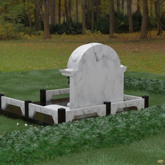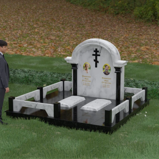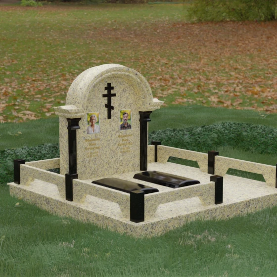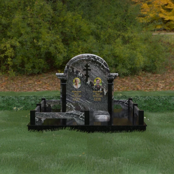 Комбинирование двух контрастных видов камня, как показано на представленных образцах, позволяет выделить ключевые детали: например, сделать светлые колонны на фоне темной стелы или выделить надгробные плиты. Широкая плоскость арки идеально подходит для размещения двух портретов — будь то гравировка или фотокерамика в медальонах. Пропорции стелы позволяют симметрично расположить памятные надписи, сохраняя визуальный баланс и эстетическую гармонию всей композиции.