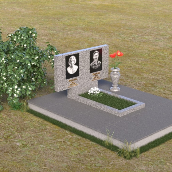 Представленный памятник (артикул ПГ001) являет собой образец строгости и лаконичности, где каждая деталь подчинена общей концепции увековечивания памяти. Композиция состоит из основания, облицованного серыми плитами, горизонтальной плиты, и вертикальной плиты с портретами. Дополнительно предусмотрена тумба для вазы.