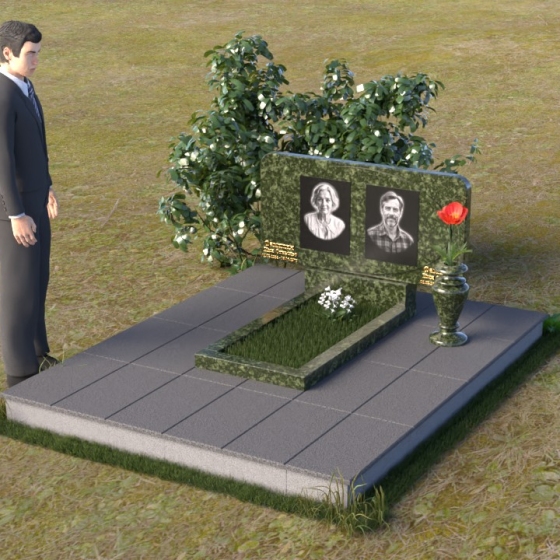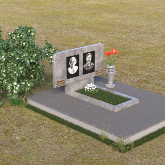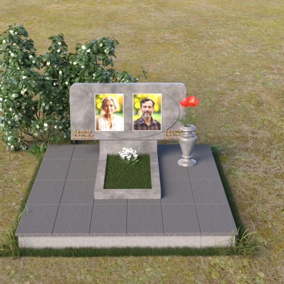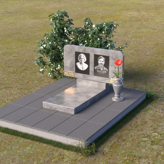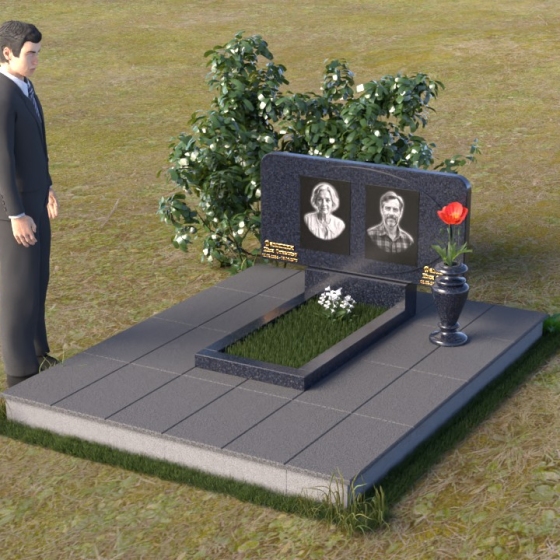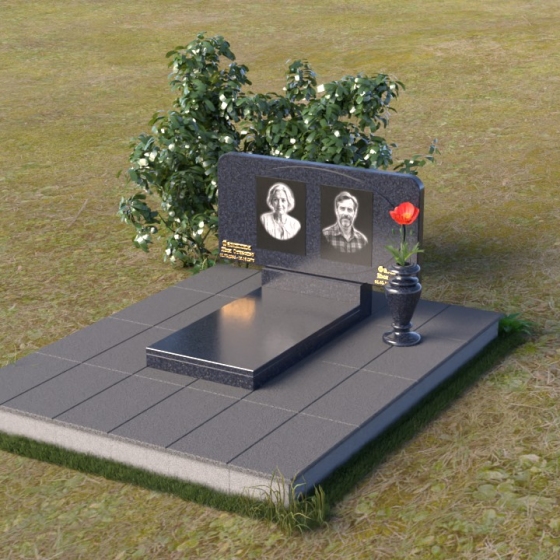 Форма стелы этого ритуального изделия идеально подходит для размещения двух портретов. Композиция с двумя изображениями, выполненными в технике гравировки, выглядит гармонично и сбалансированно. Под портретами можно расположить надпись с именем, датами жизни и короткой эпитафией. Золотое тиснение букв на черном граните создает эффект контраста и придает тексту дополнительную выразительность. Небольшая тумба, расположенная под стелой, служит подставкой для плиты с именами и годами жизни. Рядом с памятником можно установить вазу для цветов, выполненную в том же стиле и из того же материала, что и сам памятник. Это создаст единый ансамбль и подчеркнет целостность композиции. Дополнительно можно установить лампаду или небольшой фонарь, которые будут освещать памятник в темное время суток, создавая атмосферу умиротворения и светлой памяти.