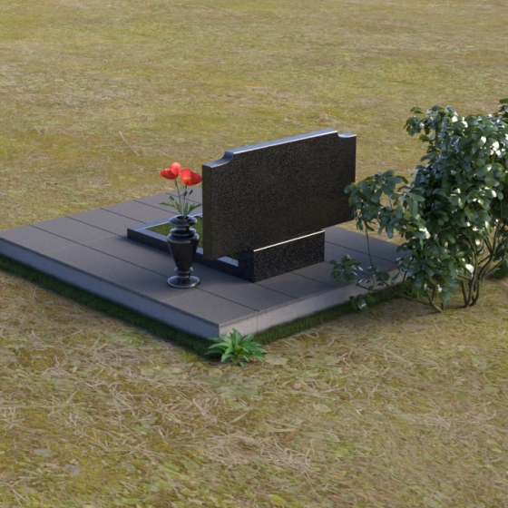Мемориальная композиция ПГ029 представляет собой элегантную стелу из полированного гранита, установленную на широкое основание, облицованное плиткой. Верхняя часть стелы имеет мягкие, скругленные углы, придающие ей более мягкий и умиротворяющий вид. Левая и правая верхние части стелы имеют плавные вырезы, создавая эффект утонченности и легкости. Фаски по периметру стелы деликатно сглажены, что добавляет общей гармонии. Зеркальная полировка камня отражает свет, создавая ощущение сияния и подчеркивая глубину черного цвета. Под стелой расположена горизонтальная плита меньшего размера, также выполненная из полированного гранита, служащая местом для возложения цветов или установки лампады. Справа от стелы располагается ваза из черного гранита, дополняющая мемориальный ансамбль.
