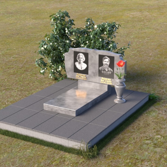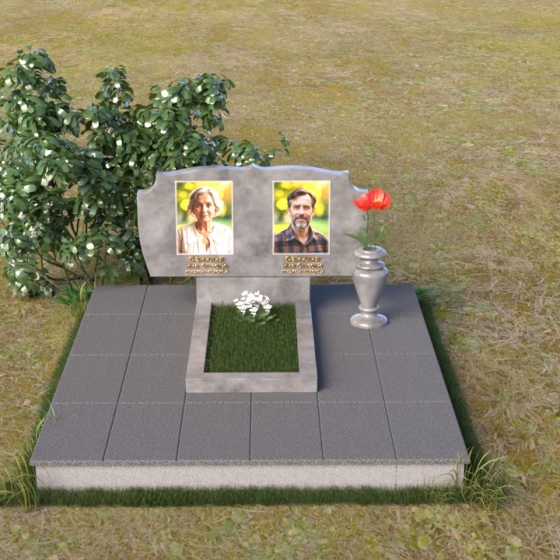 Композиция монумента строится на контрасте плавных линий и строгих геометрических форм. Верхняя часть, несущая на себе портреты усопших, имеет форму, напоминающую раскрытую книгу или свиток, где каждая страница хранит историю жизни. Края этого "свитка" искусно обработаны: верхняя грань словно оплавлена временем, приобретая мягкие, неровные очертания, а боковые стороны имеют более четкий, но все же сглаженный профиль. Фаска, идущая по периметру, придает верхней части визуальную легкость, отделяя ее от основания. Нижняя часть представляет собой прямоугольную плиту с зеркальной полировкой, отражающей небо и окружающий мир, создавая эффект бесконечности и связи с ушедшим. Она словно портал, соединяющий мир живых и мир мертвых, напоминая о непрерывности бытия. Боковины плиты имеют четкую геометрию, подчеркивая основательность и незыблемость памяти.