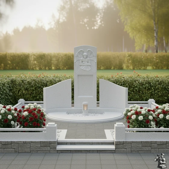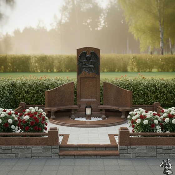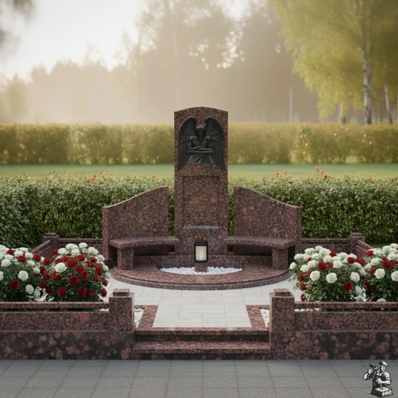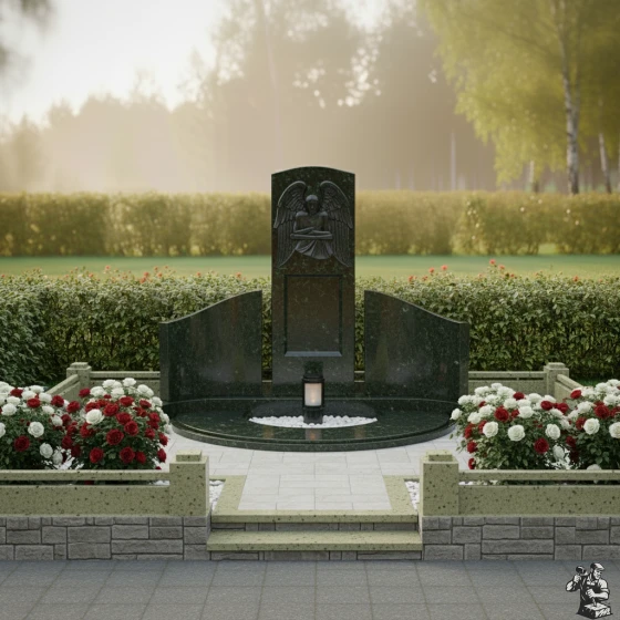 По обе стороны от центральной стелы расположены две полукруглые, словно обнимающие ее, боковые плиты. Их плавная, изогнутая форма создает ощущение защищенности и уюта, формируя единое, замкнутое пространство. Эти боковые элементы также имеют безупречную зеркальную полировку, что позволяет им отражать окружающий свет и создавать визуальную глубину. Основание мемориальной композиции выполнено в виде полукруглой надгробной плиты, которая не только придает конструкции законченный и монументальный вид, но и значительно упрощает уход за местом упокоения. В центре этой плиты, в небольшом углублении, предусмотрено место для лампады или небольшой вазы, что позволяет добавить к композиции элементы живого огня или цветов, символизирующих неугасаемую память.