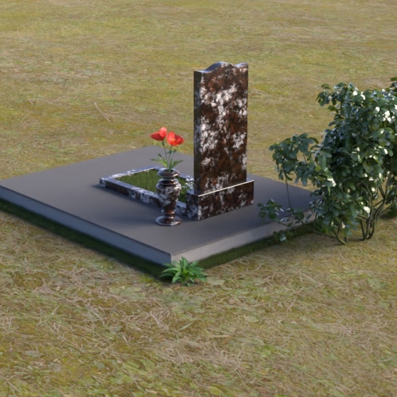 Величественная стела памятника ПВ 008 представляет собой элегантное сочетание строгих линий и плавных изгибов. Верхняя часть стелы имеет волнообразную форму, смягчающую строгость камня и придающую ей утонченность. Грани стелы тщательно отполированы до зеркального блеска, отражая свет и создавая ощущение легкости и воздушности. На лицевой стороне стелы размещен портрет усопшего, выполненный методом гравировки. Ниже располагаются надпись с именем и датами жизни. Под стелой расположена горизонтальная плита, также выполненная из полированного гранита. Ее строгие прямоугольные формы контрастируют с плавными линиями стелы, подчеркивая ее выразительность. Фаски по периметру плиты смягчают углы и придают ей завершенный вид. Рядом со стелой установлена небольшая ваза из темного гранита с изящным орнаментом, предназначенная для живых цветов.