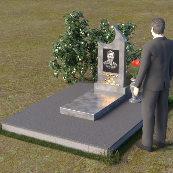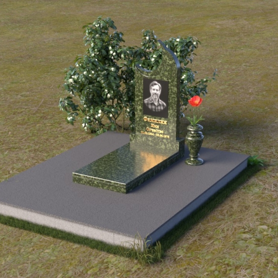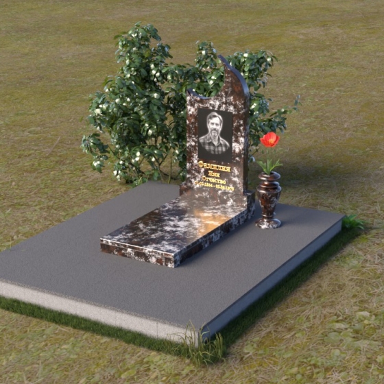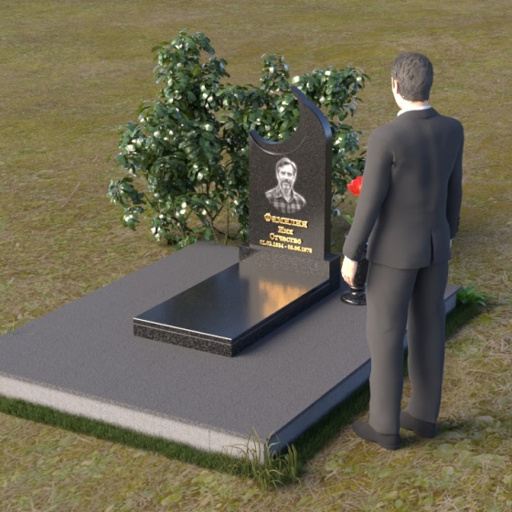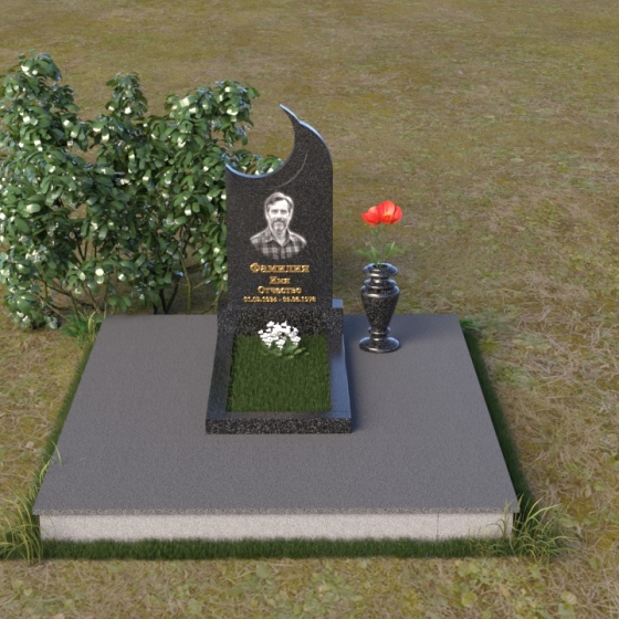 Этот гранитный монумент притягивает взгляд своей необычной формой. Основной элемент – вертикальная плита, увенчанная плавной, асимметричной дугой, напоминающей полумесяц. Её левая сторона чуть выше правой, что создает ощущение динамики и незавершенности, словно оборвавшейся жизни. Поверхность лицевой стороны отполирована до зеркального блеска, отражая небо и окружающий пейзаж, создавая иллюзию глубины и пространства. На полированной поверхности выгравирован портрет усопшего, надпись с именем и датами жизни. Нижняя часть монумента, сопрягаясь с горизонтальной плитой, образует единый ансамбль. Переход между вертикальной и горизонтальной плоскостями подчеркнут небольшой ступенькой, добавляющей конструкции объема. Горизонтальная плита, в свою очередь, также отполирована до блеска, отражая свет и усиливая эффект монументальности. Фаски на гранях плиты аккуратно обработаны, что придает памятнику завершенный и элегантный вид. Сбоку от монумента расположена небольшая гранитная ваза, предназначенная для живых цветов, которые станут символом вечной памяти и любви.